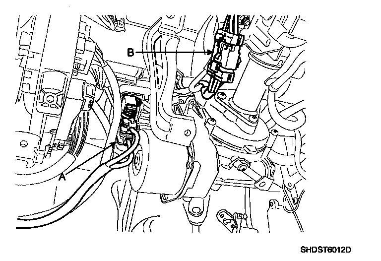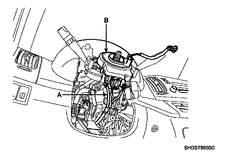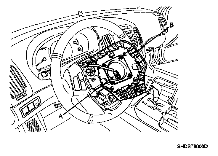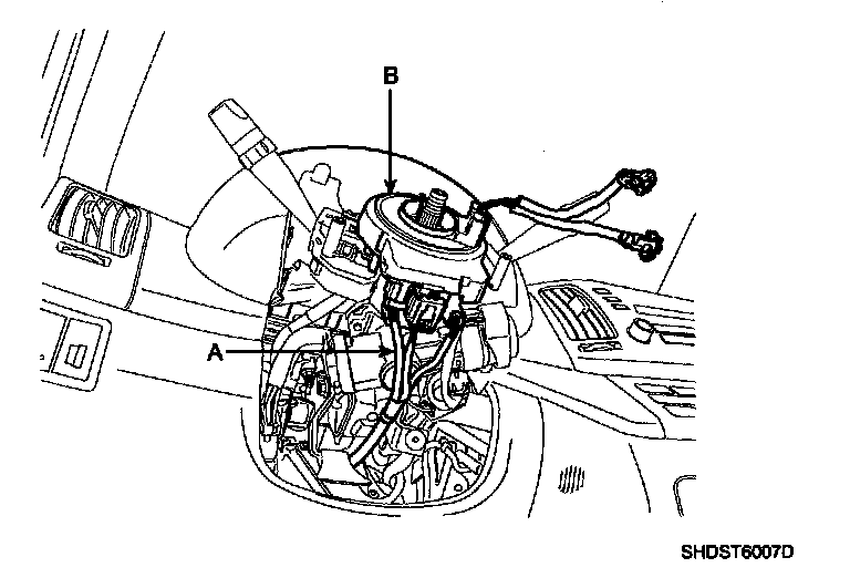 8. Disconnect the connectors (A) from the lower portion of the clock spring and then remove the clock spring (B) from the steering column shaft.