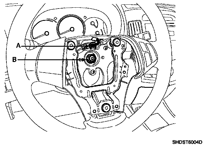 5. Disconnect the remote switch connector (A) and re move the steering wheel lock nut (B) and washer.