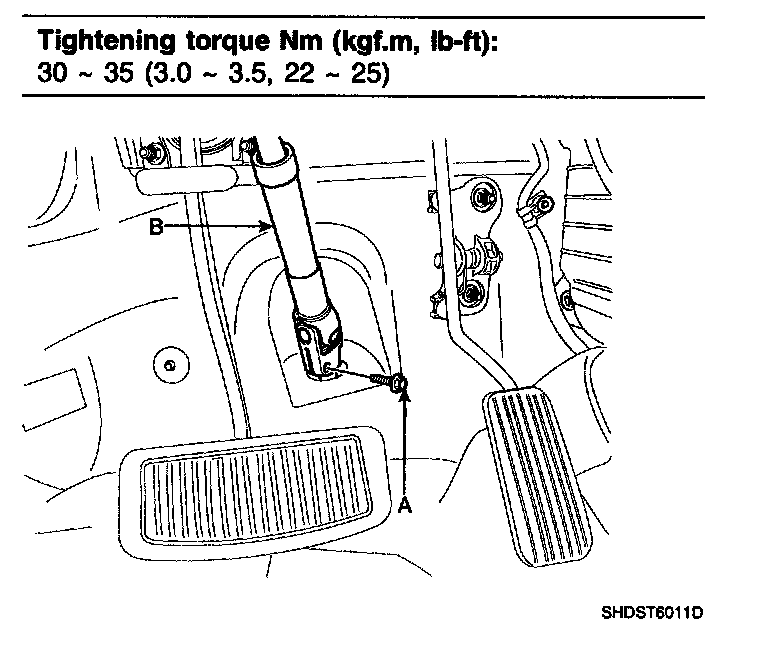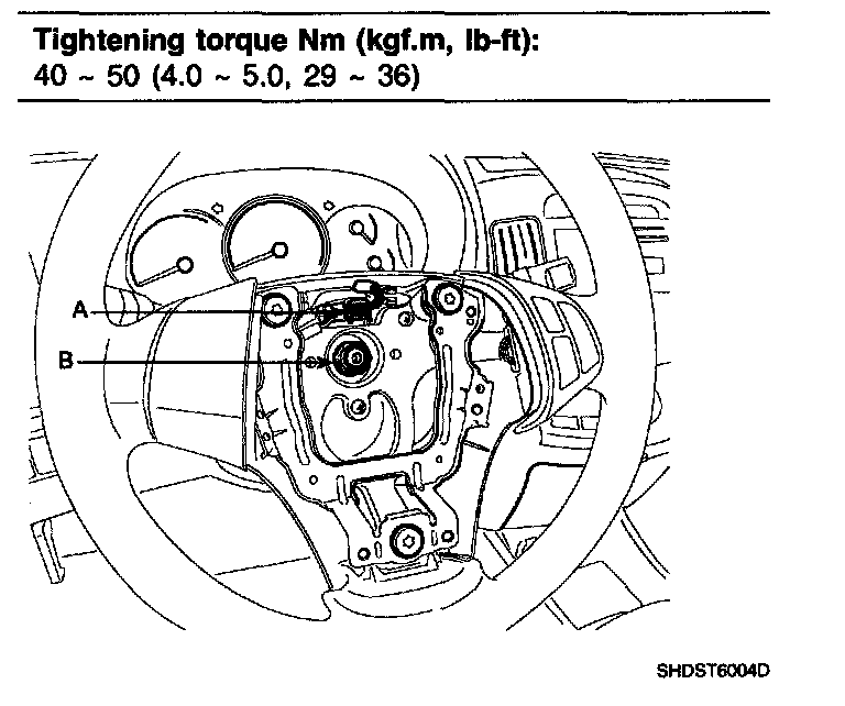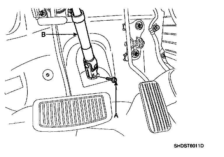 1. Install the steering column & universal joint assembly by tightening the bolts (B) and nuts (A).