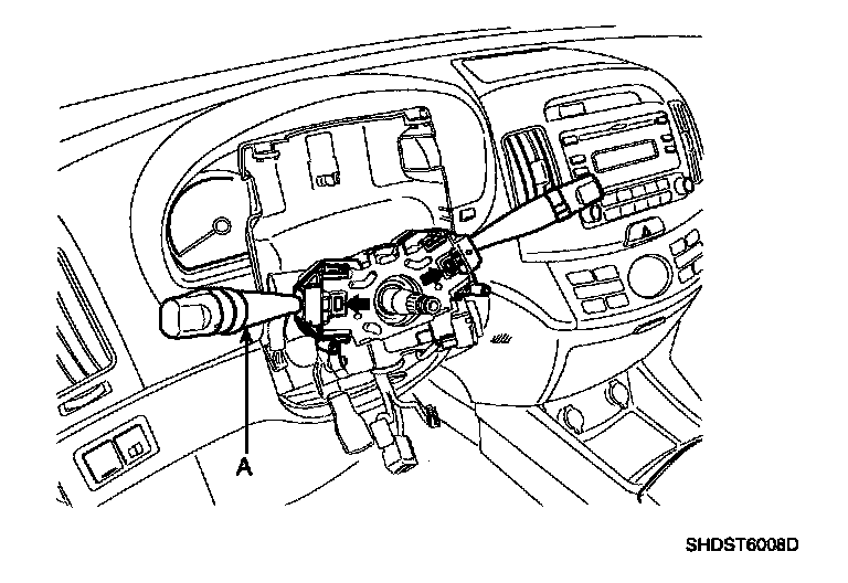 9. Remove the multifunction switches (A) from the steering column with the portion indicated by the arrow pressed.