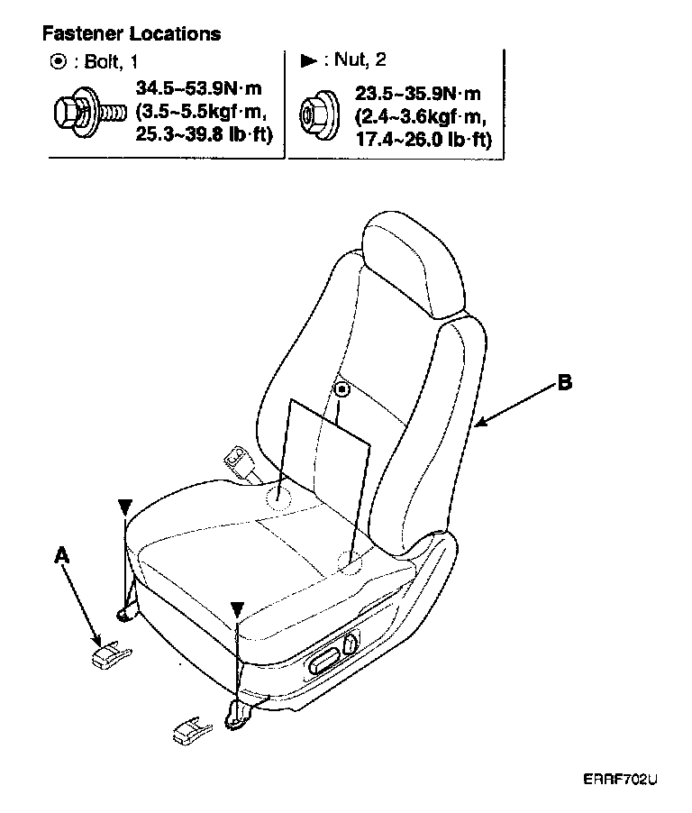 2. After loosening the passenger seat assembly mounting bolt and nut, remove the seat assembly (B).