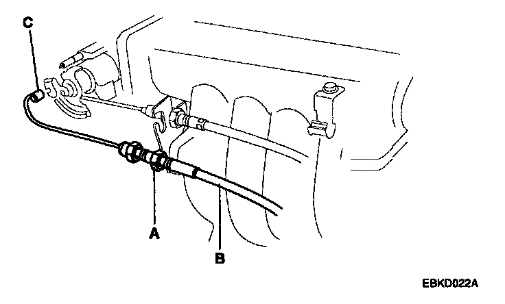 1. Loosen the locknuts (A) and disconnect the actuator cable (B) from the throttle linkage (C).