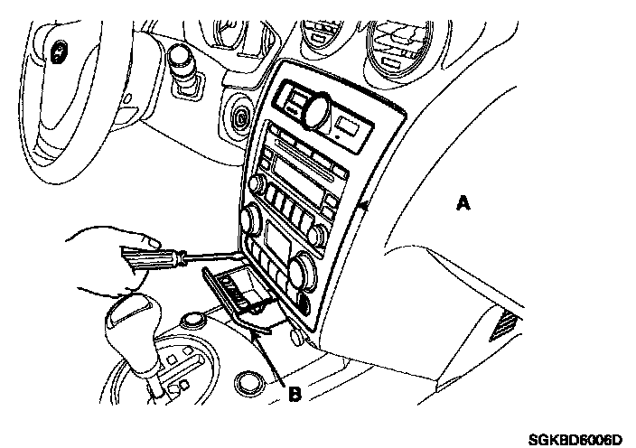 12. Open the ashtray (B). Insert a screw driver into the area between the center facia panel lower portion and ashtray, and then pull out the center facia panel lower portion. Lift up the center facia panel (A) with hand.