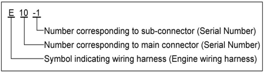 A Connector identification symbol consists of a wiring harness location classification symbol corresponding to a wiring harness location and number corresponding to the connector.