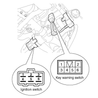 1. Disconnect the ignition switch connector and key warning switch connector from under the steering column.