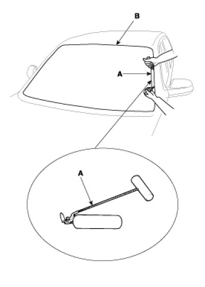9. Use glass holder (A) to hold the windshield over the opening, align it with the alignment marks (B) made in step 15, and set it down on the adhesive. Lightly push on the windshield until its edges are fully seated on the adhesive all the way around. Do not open or close the doors until the adhesive is dry.