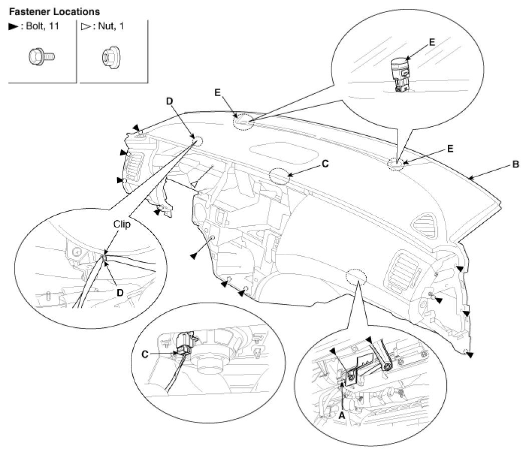 - Before tightening the bolts, make sure the crash pad wire harnesses are not pinched.
