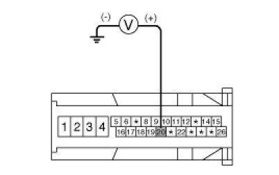 2. Measure the voltage between terminal 20 of the ABS control module harness side connector and body ground when brake pedal is depressed.
