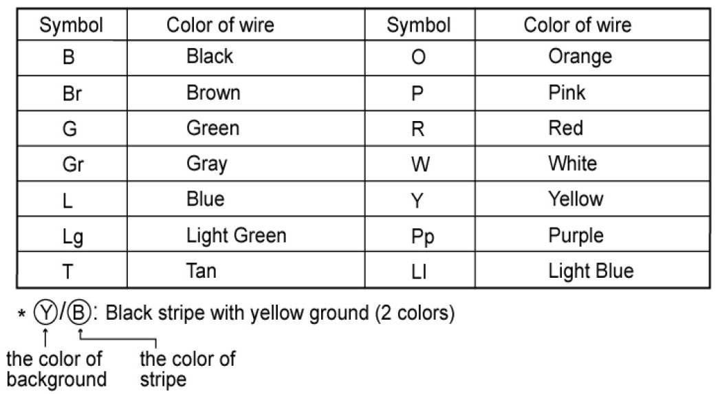 The following abbreviations are used to identify wire colors in the circuit schematics.