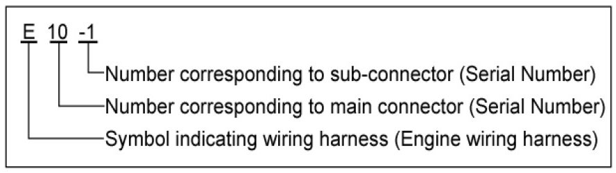 A Connector identification symbol consists of a wiring harness location classification symbol corresponding to a wiring harness location and number corresponding to the connector.
