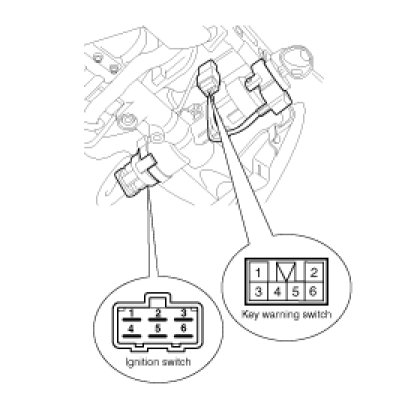1. Disconnect the ignition switch connector and key warning switch connector from under the steering column.
