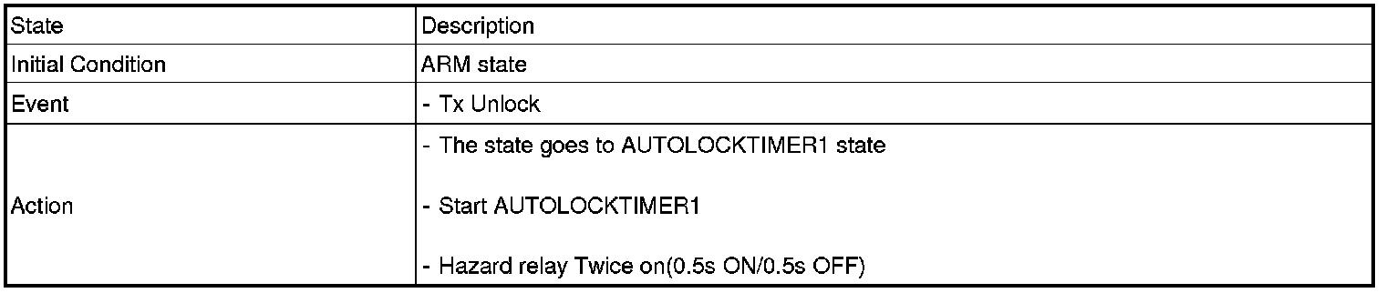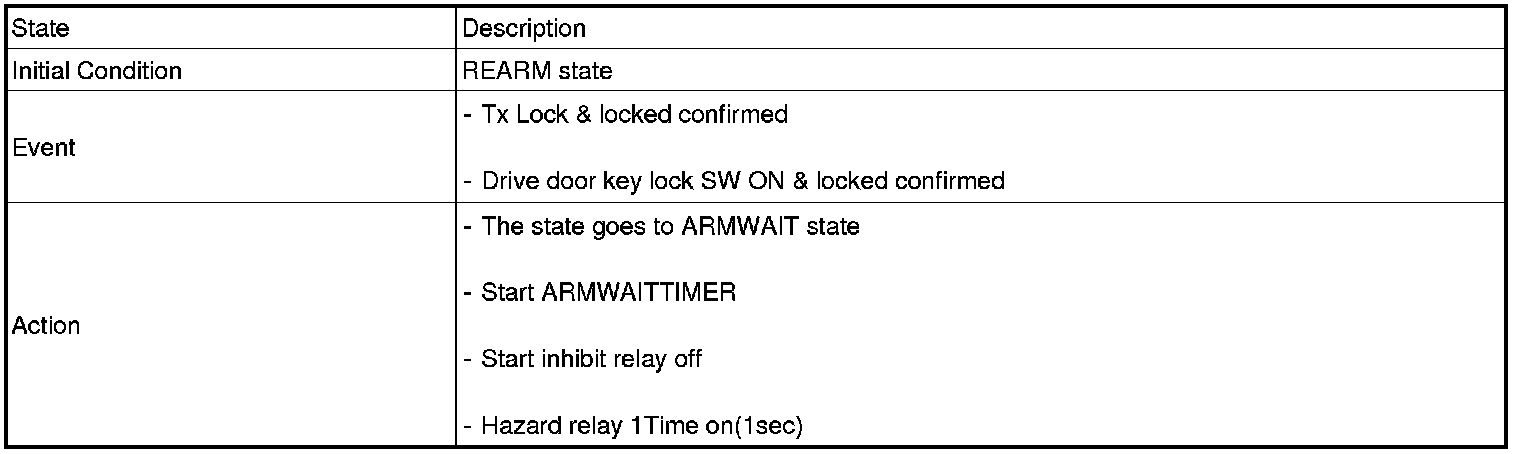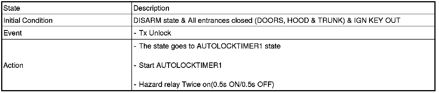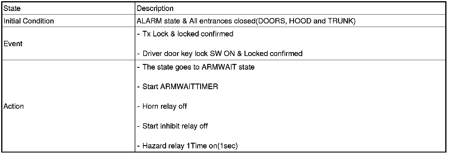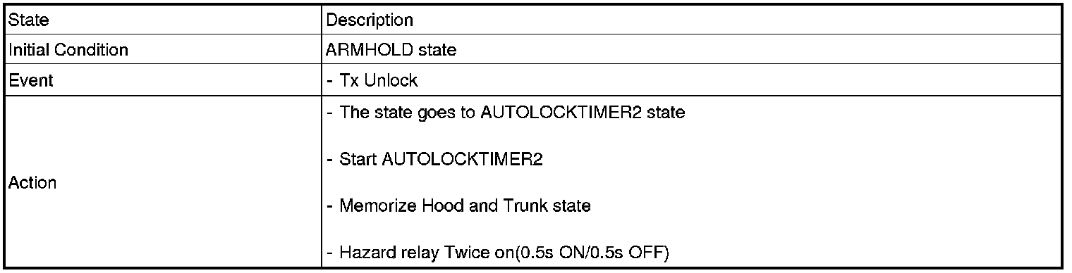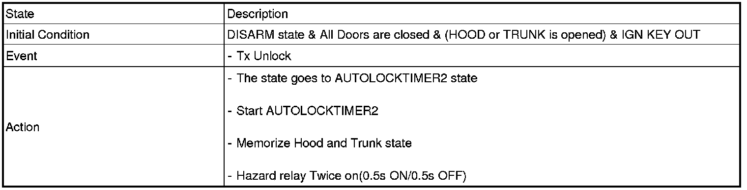 1. Under DOOR, TRUNK or HOOD: Closed, HORN(T2 output), HAZARD(1s-output) signals are output if TLOCK signal is received again within T1 from the moment when the mode transits to ARM mode by TLOCK operation and ARM mode is kept.