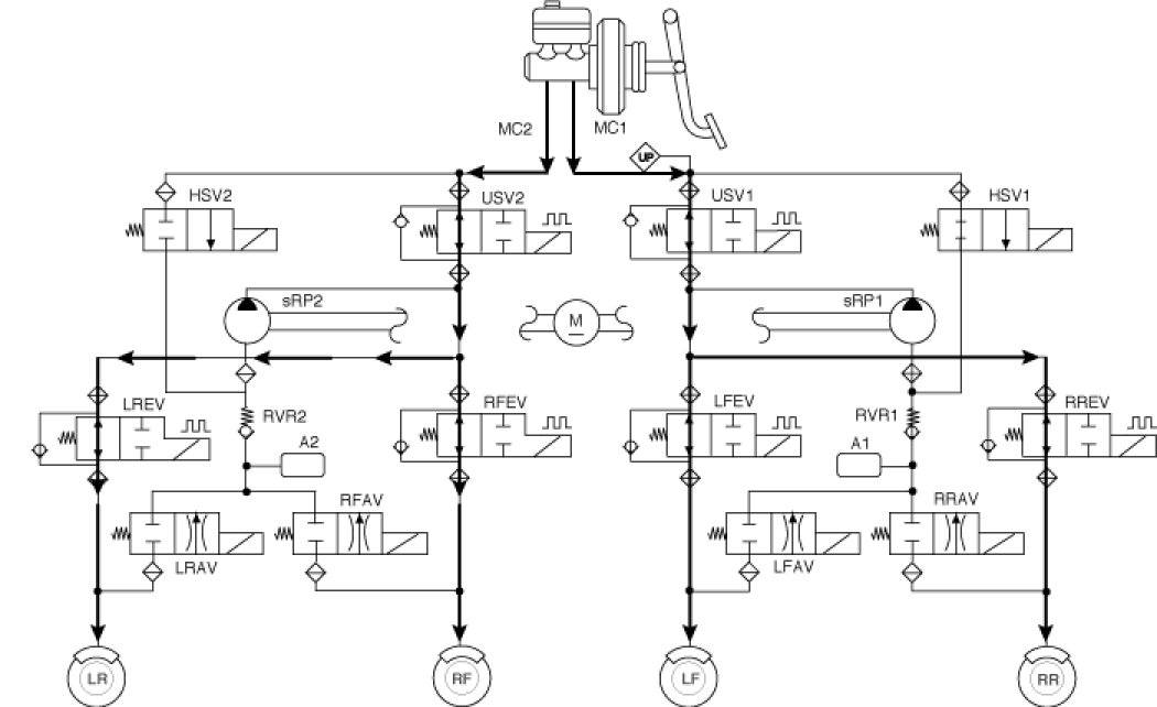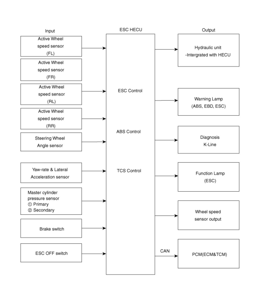 ABS/EBD function : The ECU changes the active sensor signal (current shift) coming from the four wheel sensors to the square waveform.By using the input of above signals, the ECU calculates the vehicle speed and the acceleration & deceleration of the four wheels.And, the ECU judges whether the ABS/EBD should be actuated or not.
