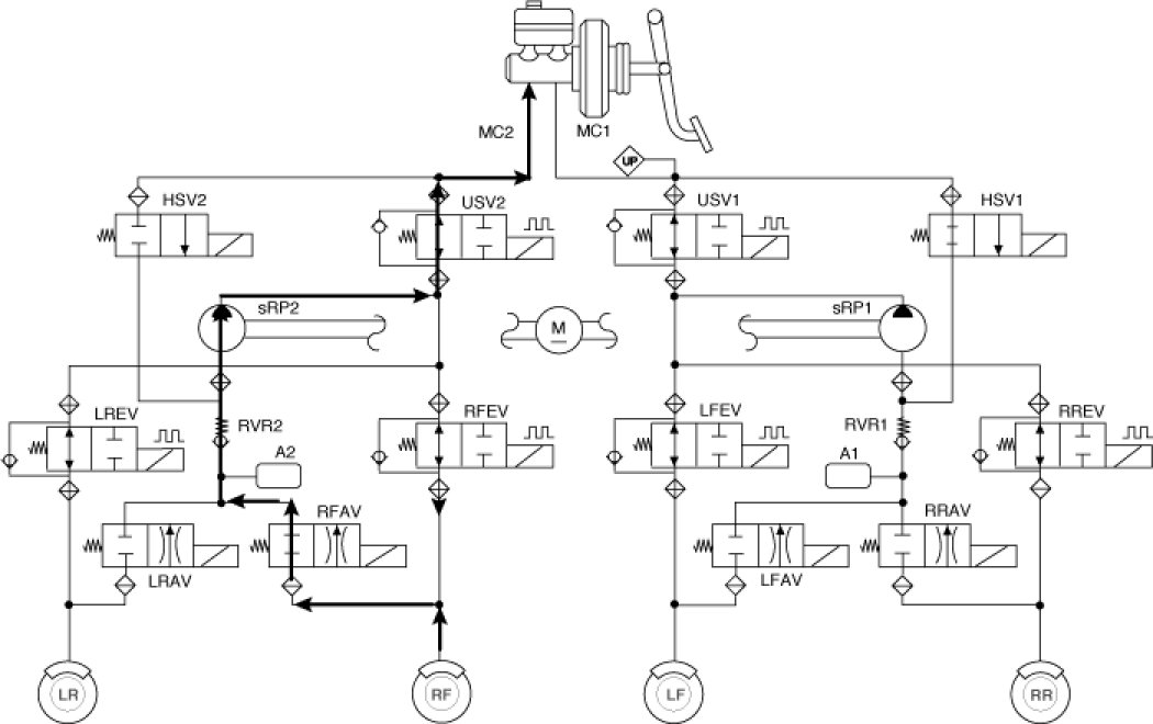 ESC adds a further function known as Active Yaw Control (AYC) to the ABS, TCS, EBD and ESC functions. Whereas the ABS/TCS function controls wheel slip during braking and acceleration and, thus, mainly intervenes in the longitudinal dynamics of the vehicle, active yaw control stabilizes the vehicle about its vertical axis.