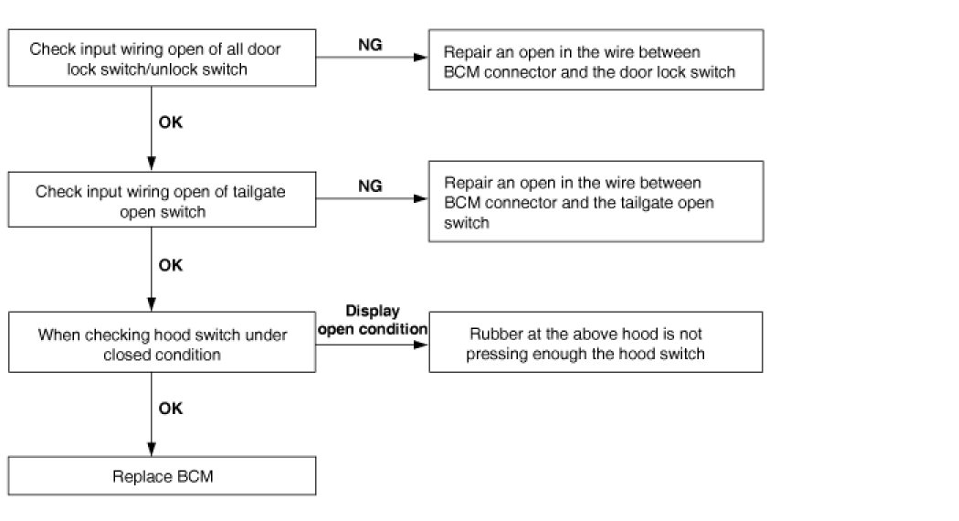 3. When door is opened, burglar alarm does not work. (If tailgate and hood is opened, alarm works)