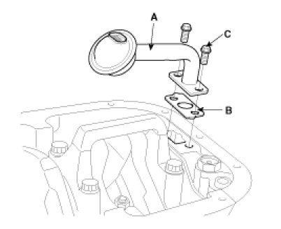Install a new gasket (A) and oil screen (B) with 2 bolts(C).