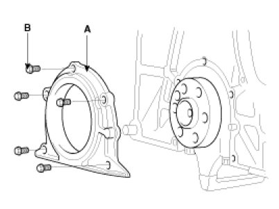 11. Install a new gasket and rear oil seal case (A) with 5 bolts (B).