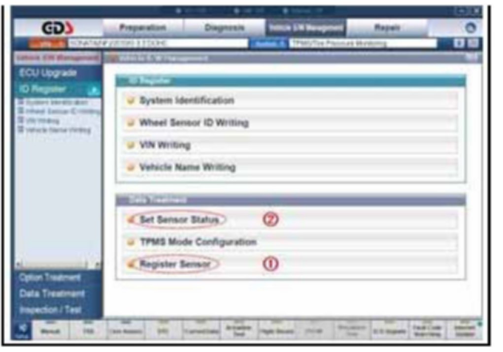 See GDS section for procedures for registering sensors, setting sensor status, and setting TPMS mode configuration.