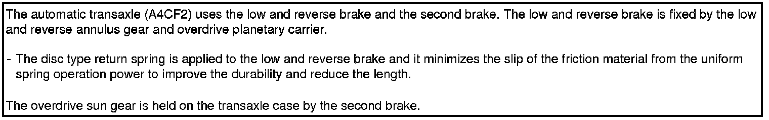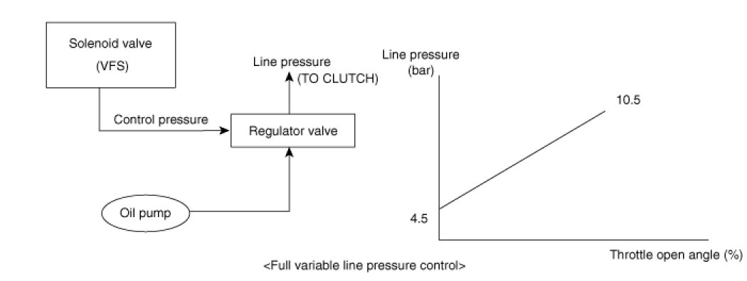 The VFS (Variable Force Solenoid) installed in the valve body is applied to transaxle(A4CF2). VFS varies the line pressure from 4.5bar to 10.5bar according to throttle open angle and shift range to improve the fuel consumption and shift ability.