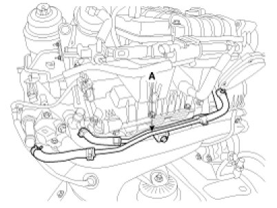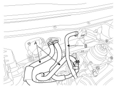 15. Connect the heater hoses (A) and brake vacuum hose (B).