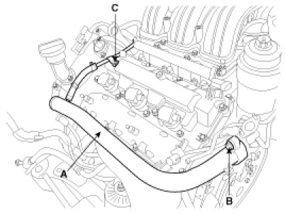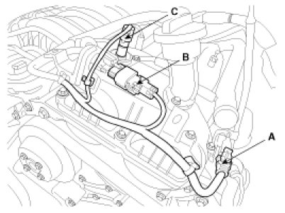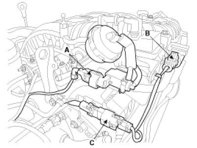 (7) Disconnect the VIS solenoid valve connector (A) ,PCSV connector (B) and RH oxygen sensor connector (C).
