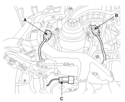 (6) Disconnect the LH intake camshaft CMP sensor connector (A) ,RH intake camshaft CMP sensor connector (B) and condenser connector (C).