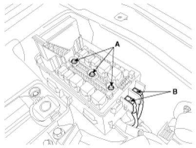 12. Remove the fuse & relay box mounting bolts (A) and wiring mounting bolts (B).