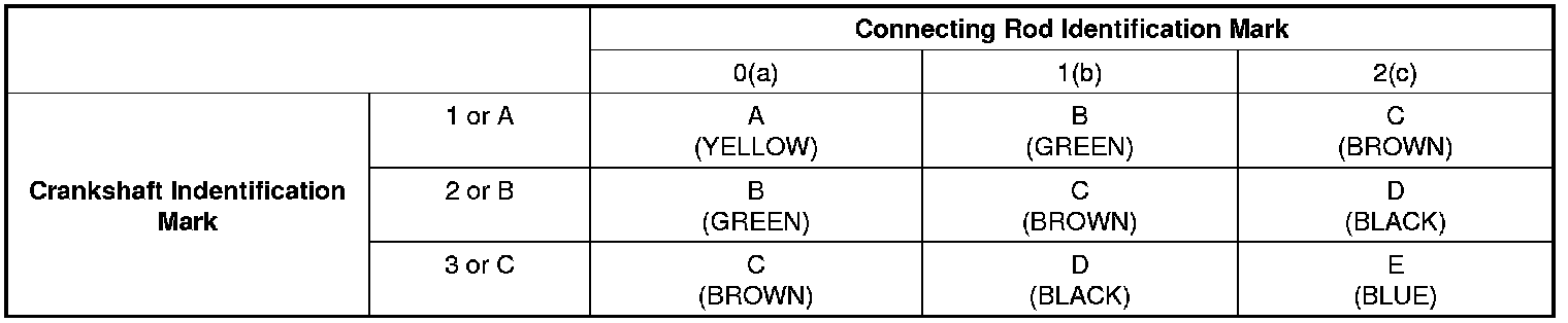 (6) If the plastigage measures too wide or too narrow, remove the upper half of the bearing, install a new, complete bearing with the same color mark (select the color as shown in the next column), and recheck the clearance.