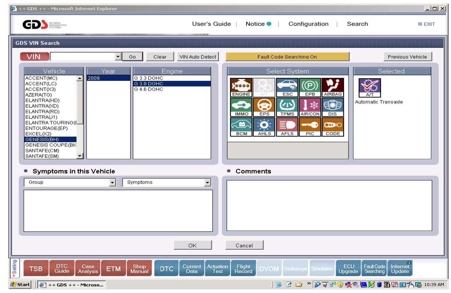 1. Select the vehicle information and A/T as the system and click OK. If the VIN is not automatically selected, select "Clear" and manually select the VIN.