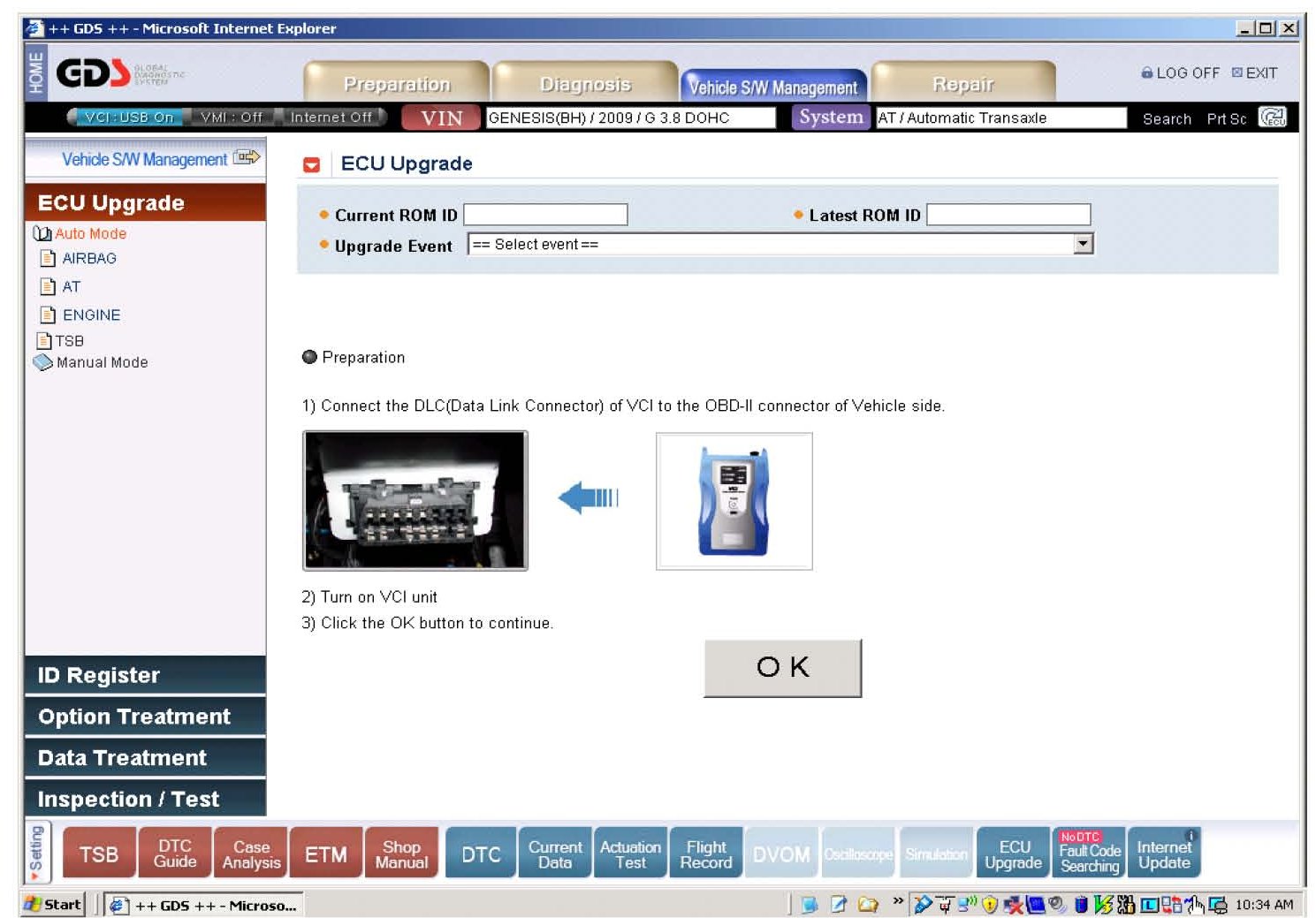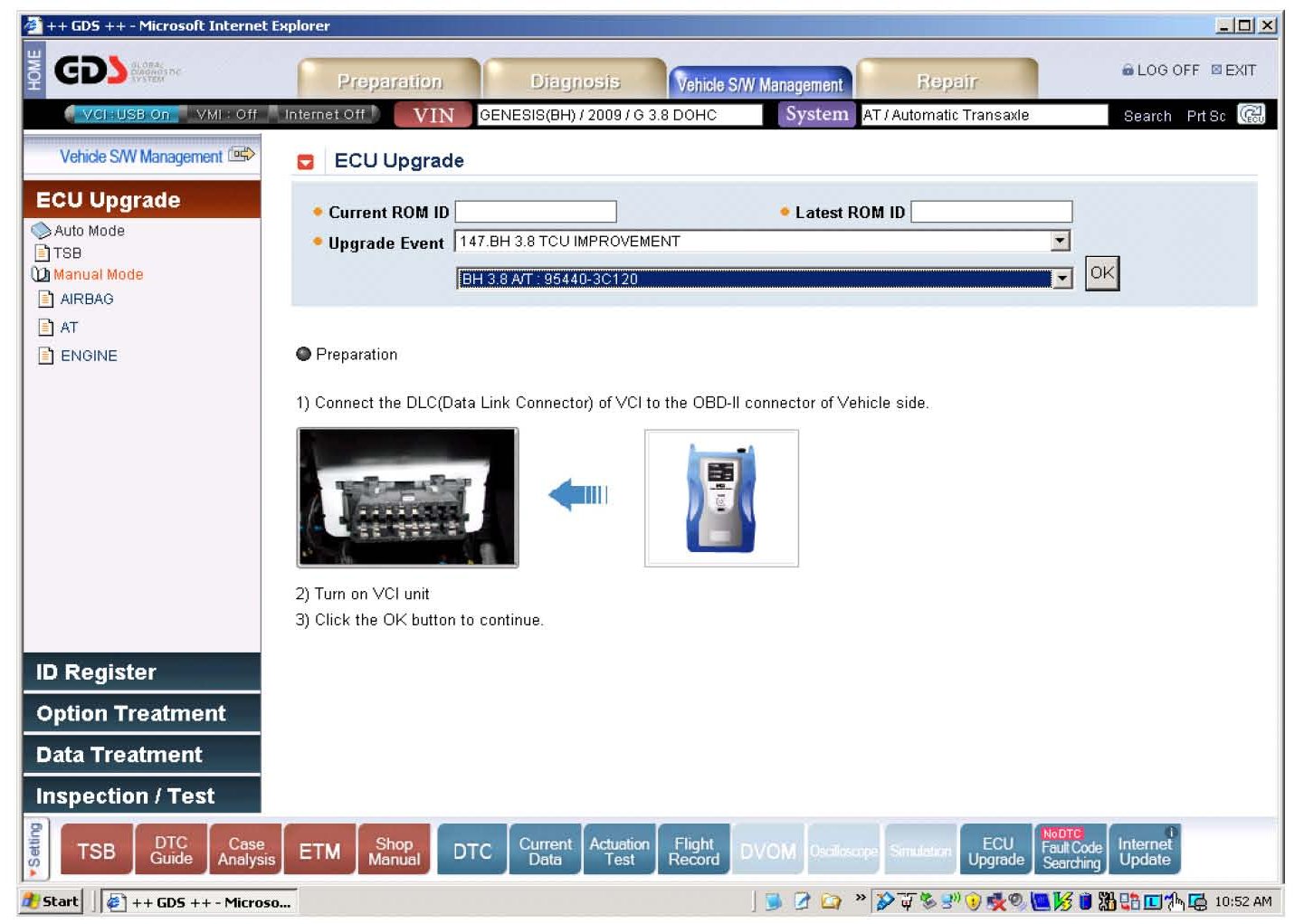 2. From the ECU Upgrade window, select Manual Mode and AT. Select Upgrade Event 147 BH 3.8 TCU IMPROVEMENT. Select BH 3.8 A/T 95440-3C120 as the system and select OK.