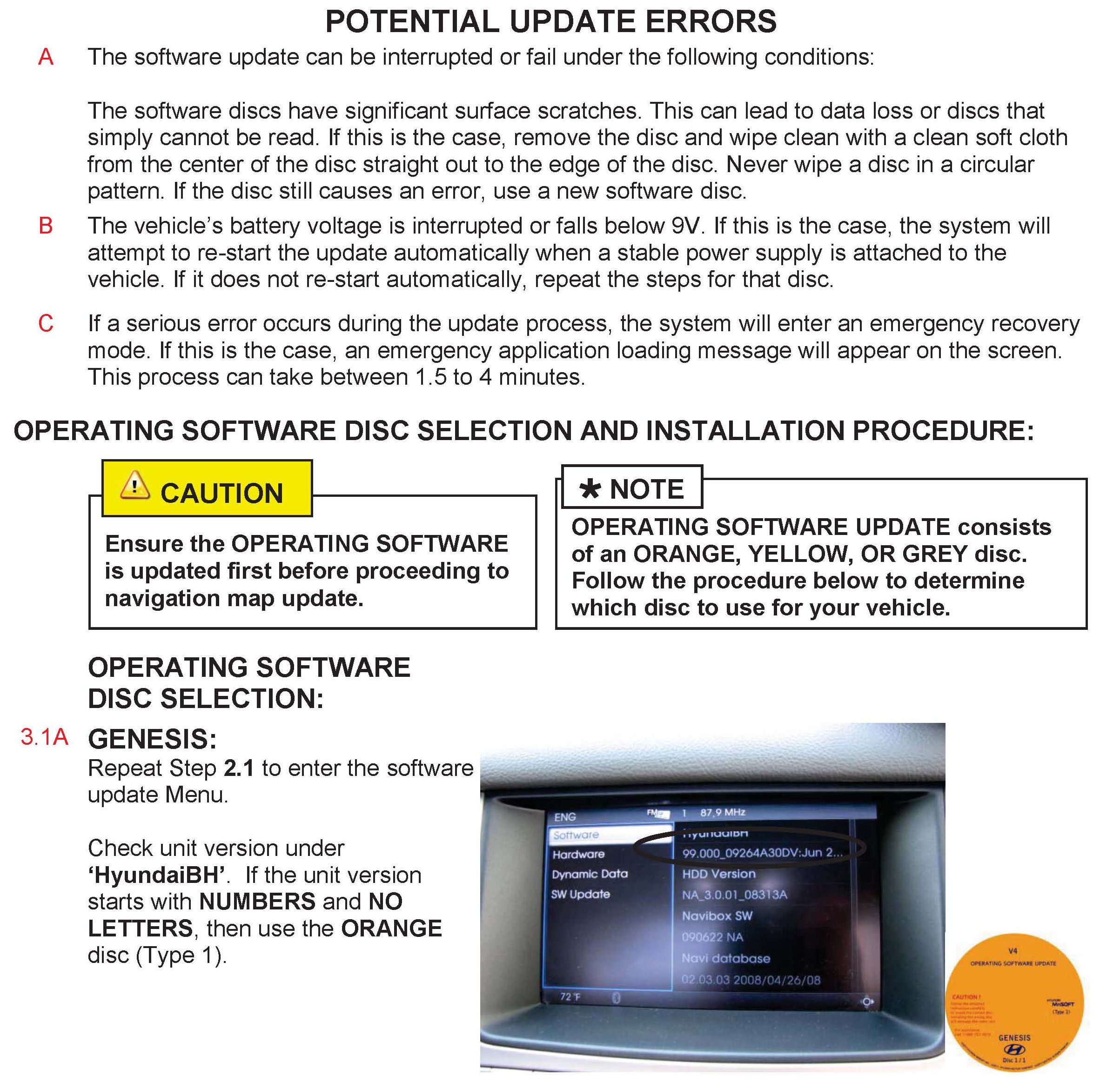 POTENTIAL UPDATE ERRORS AND OPERATING SOFTWARE DISC SELECTION AND INSTALLATION PROCEDURE: