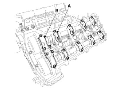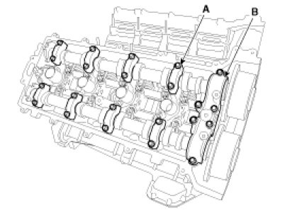 (4) Install the bearing cap (A) and thrust bearing cap (B) with specified torque.