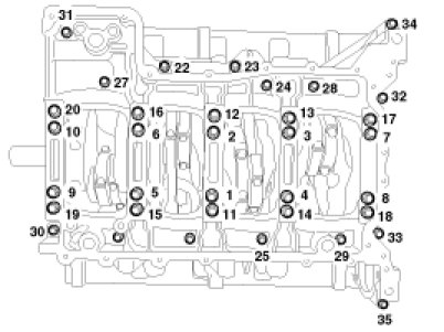 Main bearing cap bolts (1 - 20) 37.3 - 41.2 N.m (3.8 - 4.2 kgf.m, 27.5 - 30.4 lb-ft) + 120°
