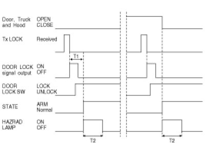 (1) Under DOOR, TRUNK or HOOD: closed, horn and hazard(1s-output) signals are output if RKE LOCK signal is received again within T1 from the moment when the mode transits to ARM mode by RKE LOCK operation and ARM mode is kept.