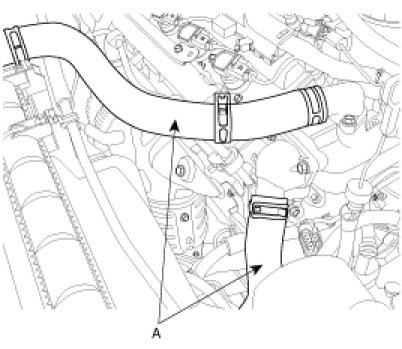 8. Remove the upper radiator hose and the lower radiator hose(A).