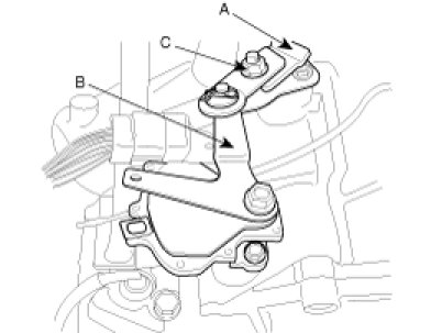 2. Loosen the control cable(A) to manual control lever flange nut(C) to free the cable and lever(B).