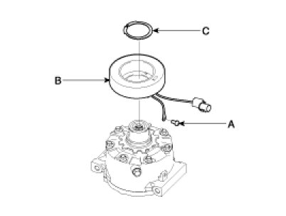 4. Remove the screw (A) from the field coil ground terminal. Remove the retainer ring (B) and then remove the field coil (C) from the shaft with a puller. Be careful not to damage the coil and compressor.