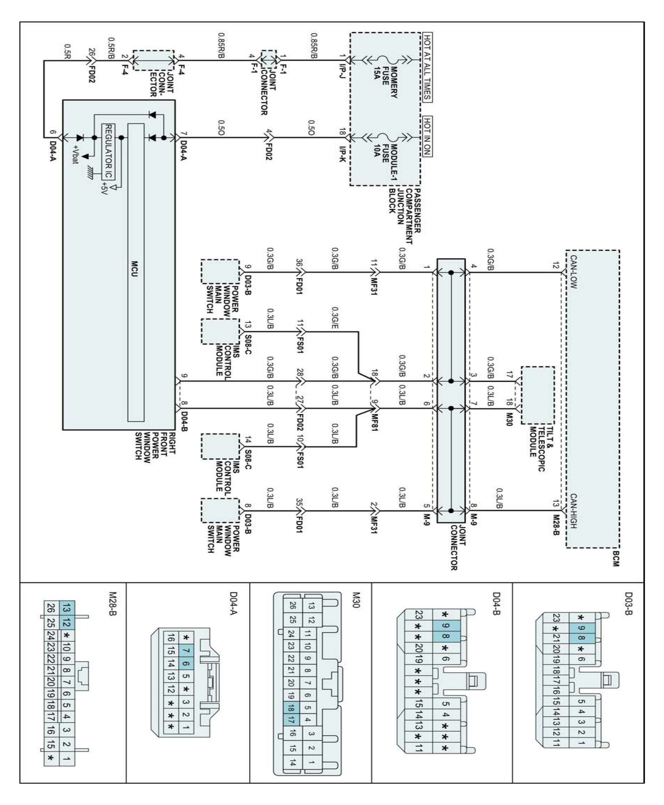 To make system be more efficient, Body Control Module (hereinafter referred to BCM) applies CAN (Controller Area Network) communication system. CAN is a kind of communication system which can make related component share system information with just two line instead of complex individual signal line. It consists of related component and CAN BUS which consists of CAN_high line and CAN_low line. Each component can send and receive information by binary signal via CAN BUS. The related components for BCM are BCM, ADM, DDM and IMS (Seat, S/C)