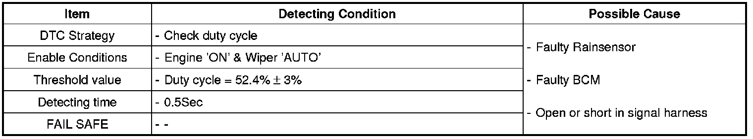 The ECM sets DTC B1907 if the Sensor cannot detect a usable input signal from the wiper control for a minimum of 0.5 seconds.