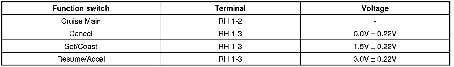 2. Measure voltage between terminals on the harness side connector when each function switch is ON (switch is depressed).