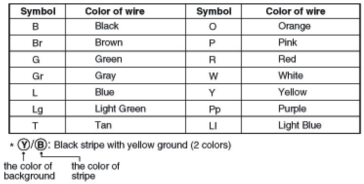 The following abbreviations are used to identify wire colors in the circuit schematics.