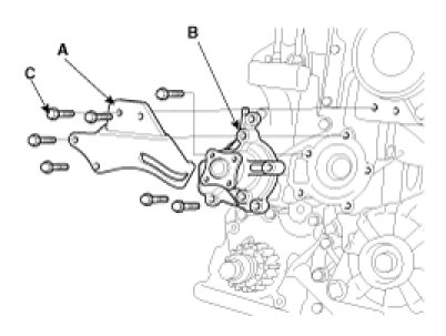Install the water pump (B) and a new gasket with the 3 bolts(C).