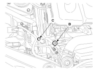 Recovery/Recycling/Charging System (A) to the high-pressure service port (B) and the low-pressure service port (C) as shown, following the equipment manufacturer's instructions.
