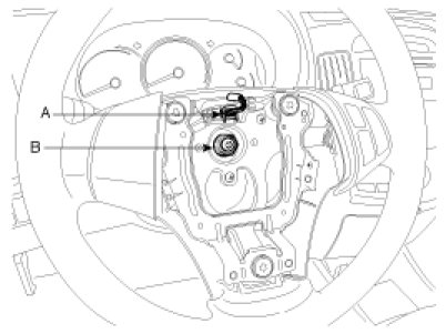 5. Disconnect the remote switch connector (A) and remove the steering wheel lock nut (B) and washer.