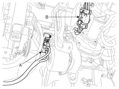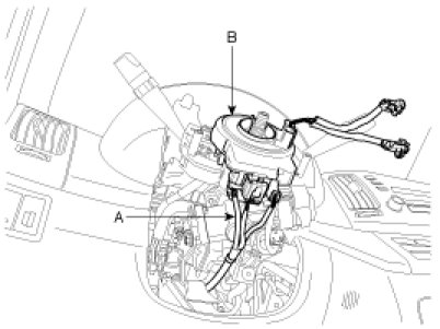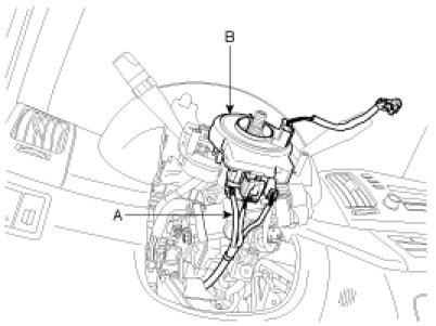 7. Install the clock spring (B) to steering column assembly and then connect the connectors (A).
