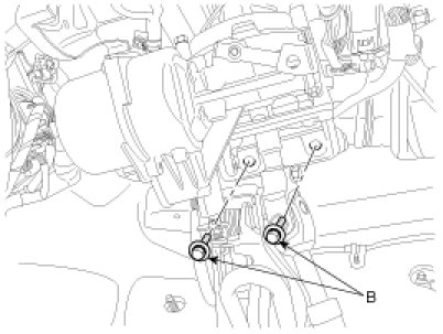 14. Remove the steering column mounting bolts (B).