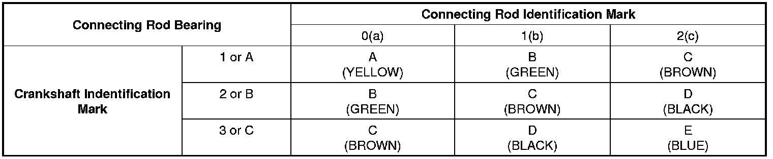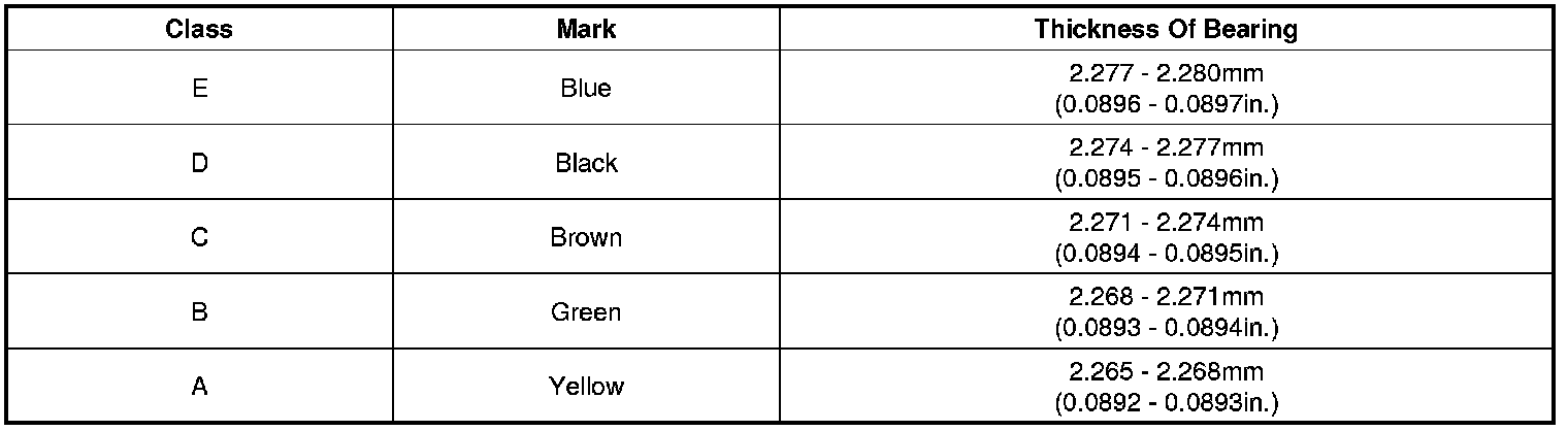 (6) If the plastigage measures too wide or too narrow, remove the upper half of the bearing, install a new, complete bearing with the same color mark (select the color as shown in the next column), and recheck the clearance.