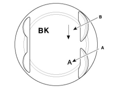 7. Check the "BK" mark, the piston size code(A) and the front mark(B) on the piston top face.