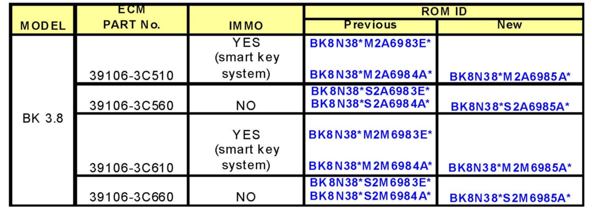 To verify the vehicle is affected, be sure to check the version of the vehicle's engine control unit ROM ID with reference to the ROM ID Information Table mentioned below before attempting to update the control unit software.