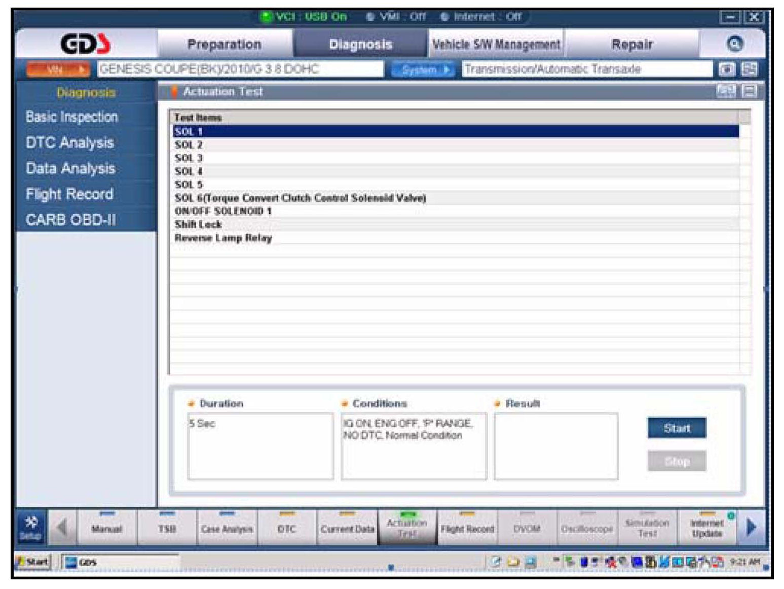 1. Using a GDS, check for DTC in the "Automatic Transaxle" menu. Record the DTC and description. Delete the DTC.
